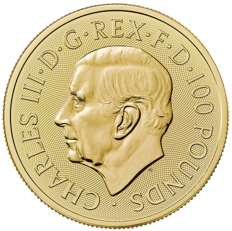 Reverso: Representación dinámica de la feroz batalla entre el héroe Beowulf y el monstruo Grendel, diseñada por David Lawrence; incluye inscripciones como el peso, pureza y año 2024. Anverso: Retrato oficial de Su Majestad el Rey Carlos III (diseño de Martin Jennings), junto al valor facial de 100 GBP y detalles de pureza .9999.