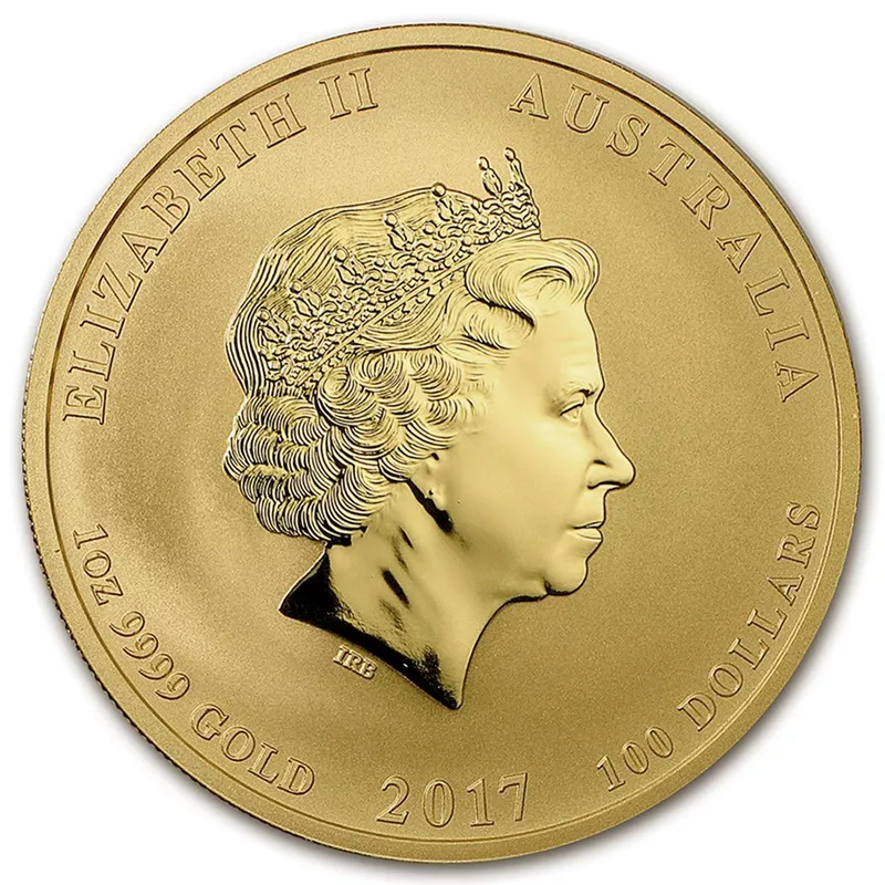 Reverso: Gallo orgulloso acompañado de gallinas y polluelos entre follaje de bambú y flores, con el carácter chino «雞» (gallo), la inscripción «Year of the Rooster» y la marca de ceca «P» de Perth Mint. Anverso: Retrato oficial de la Reina Isabel II por Ian Rank-Broadley, junto al valor facial de 50 AUD, pureza .9999 y año 2017.
